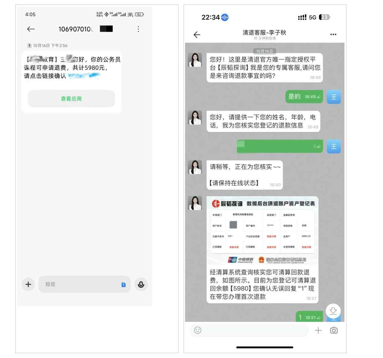 进入“公考季”,各地进行笔试。与此同时,不法分子也准备利用考生和家长的焦虑心理,设下诸多骗局。不同案例提醒大家:擦亮眼睛,管好钱包;诚信地接受测试并始终如一地骑行。四川:误以为公务员考试“策划师”培训费可以退还,损失4万多元“【XX教育】你的公务员课程可以申请退款,请点击链接确认……”收到这条短信时,家住广安华蓥市的小王并没有起疑心。为了准备公开考试,小王几个小时前报名参加了XX年的教育培训班。想到完成大部分课程后,培训费就可以退还,这对小王来说无疑是个好消息。他心里暗自高兴,就点开了链接并下载了一个名为“陈涛查询”的应用程序。 APP上的“客服”联系了小王,告知他“辰涛询价”是XX教育唯一指定授权退还培训费用的平台。帮其登记个人信息后,“客服”表示,小王可以退还5980元的培训费,由平台总策划处理退款事宜。随后,App上一位名为“总策划-霍静霆”的客服告知小王退款操作流程:即通过完成指定任务进行退款。首次:通过APP认购100元证券,即时返现130元。第二次:通过APP认购500元证券,即时返现600元。小王看到返现工作很有用,就按照对方的要求将钱转入指定账户进行认购。客人,很快账户就收到了钱。两次成功的返利让小王彻底放松了。他以为自己得到了退款,实际上却成了别人砧板上的鱼肉。眼见时机成熟,“策划人”露出了他真正的大招:选择一个方案来完成公司公司的认购工作。方案一:直接15万元认购,次日返现19.5万元。方案二:分两步投资,立即回报。第一步,认购43800元,即刻返现52560元。第二步,线下现金认购10.1万元,即可获得13.4万元大额返现,回报更高。相比之下,方案2“投资小、见效快、返利高”。小王选择了方案二,但刚转账43800元,就收到了“系统截图”:“操作错误!资金冻结!”看到43了,自己投资的800元被冻结,小王立即联系“策划人”,但对方告知:“您需要完成方案2的第二步,即在冻结解锁前支付10.1万元线下现金!如果一天内未完成后续申购,之前投资的4.38万元将被永久冻结,并可能承担相应的法律责任!”客服语气变得强硬起来。虽然小王意识到这可能是一个陷阱,但为了回回自己之前的投资,在“策划师”的不断引导下,小王赶紧拿了101000元现金,放进了一份礼物中。 “清关人员”。陷入“保底”陷阱,差点损失2万元。近年来,公考持续火爆d 上升,这引发了每个人都参与的“涨潮”。在此背景下,各类纠纷不断出现,消费者权益保护问题更加突出。为了获得录取,考生王某与培训机构签订了“保班”协议,一次性缴纳学费25999元,并明确约定“考试不及格,全额退款”。然而笔试结果公布后,未达到分数线的王某在申请退款时发现中介机构失去联系并“跑路”。无奈之下,王某向法院提起诉讼。法院经审理,最终判决该机构返还培训费21999元。提醒法官,面对各种来源不明的“担保”信息,一定要保持谨慎,切勿泄露个人信息或转账资金。当您遇到欺诈行为时,应向请尽快向公安机关举报,通过法律途径维护您的合法权益。警报先生说:备考没有捷径,失败就是陷阱!河南:花钱招公务员? 2025年7月,河南省新蔡县人民法院公布了一起冒充组织部门负责人诈骗案。被告人邢某某等人利用“双重行为”,谎称自己能办理公务员招录和学生选调工作,并侵占两名受害人50万元。最终他因诈骗罪受到处罚。 2022年4月,被告人邢某某伙同任某某、韩某某等人(已判刑),为骗取刘某某的信任,任某某冒充组织部门负责人。 2022年4月末,被告人邢某伙同任某、韩某等人,向王某骗取人民币20万元。骗取王先生的信任。案发后,涉案50万元全部退还受害人。河南省新蔡县人民法院于2025年4月30日作出刑事判决:被告人邢某某犯冒充罪、诈骗罪,判处有期徒刑二年零十个月。目前,该判决已发生法律效力。法官表示,国家、企业和机构的招聘有严格的法律程序。从报名、笔试、面试到体检、政审,整个过程公开透明,绝对不存在“内部渠道”和“花钱买工作”的可能。 Alarm先生说:花钱请人,只会造成人力财力的流失。第一类常见的“公考舞弊”行为是考前练习舞弊。部分犯罪分子开展民事考前培训违规补习班和面试辅导班。他们表示,参与评估提案的专家将担任培训班的教授。事实上,他们无证经营,制造虚假宣传,收取高额pa费,注册骗钱。第二种欺诈行为涉及出售真题。一些不法分子在考生交流网站和社交媒体群上发布虚假广告信息,谎称能在公务员考试中给出正确答案。事实上,他们以买卖笔试题、面试题答案为名进行诈骗,骗取考生钱财。第三类是在网络上冒充“高材生”的诈骗,声称自己可以充当“公考射手”,帮助考生“顺利通过考试”。 “岸”,以考试需要出示虚假证件、要求考生提供虚假材料等为由收取费用。o 提供个人信息,骗取候选人的金钱和个人隐私信息。第四类山寨网站诈骗犯罪分子利用山寨网站进行钓鱼诈骗,搭建“山寨网考网站,以“预登记、干部调配、招聘”等虚假政策信息为诱饵,吸引考生;或者以官方网站名义,在山寨公务员网站上做广告,销售山寨版公务员专业书籍。公考分类诈骗公考子程序也是不法分子常用的诈骗手段。他们经常冒充有关部门。第六类 一些不法分子假装认识人力资源部门负责人,并在其可信的情况下,经常发送含有虚假链接的短信和电子邮件,并被点击。招聘单位利